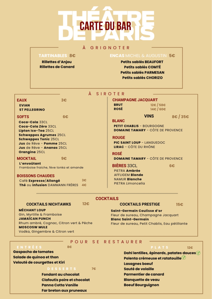 Le Bar du Théâtre de Paris est heureux de vous accueillir du mercredi au samedi, avant chaque représentation uniquement.